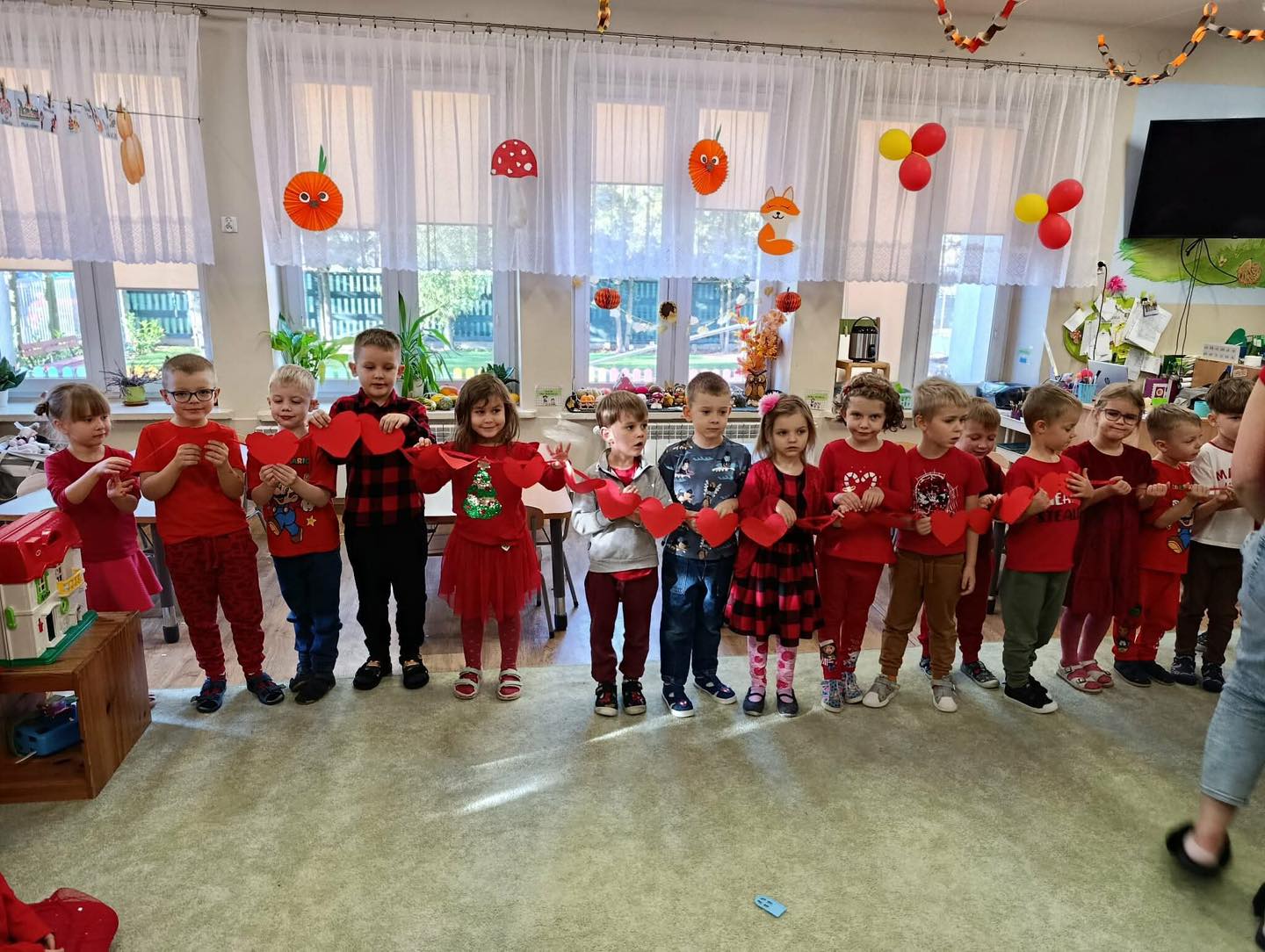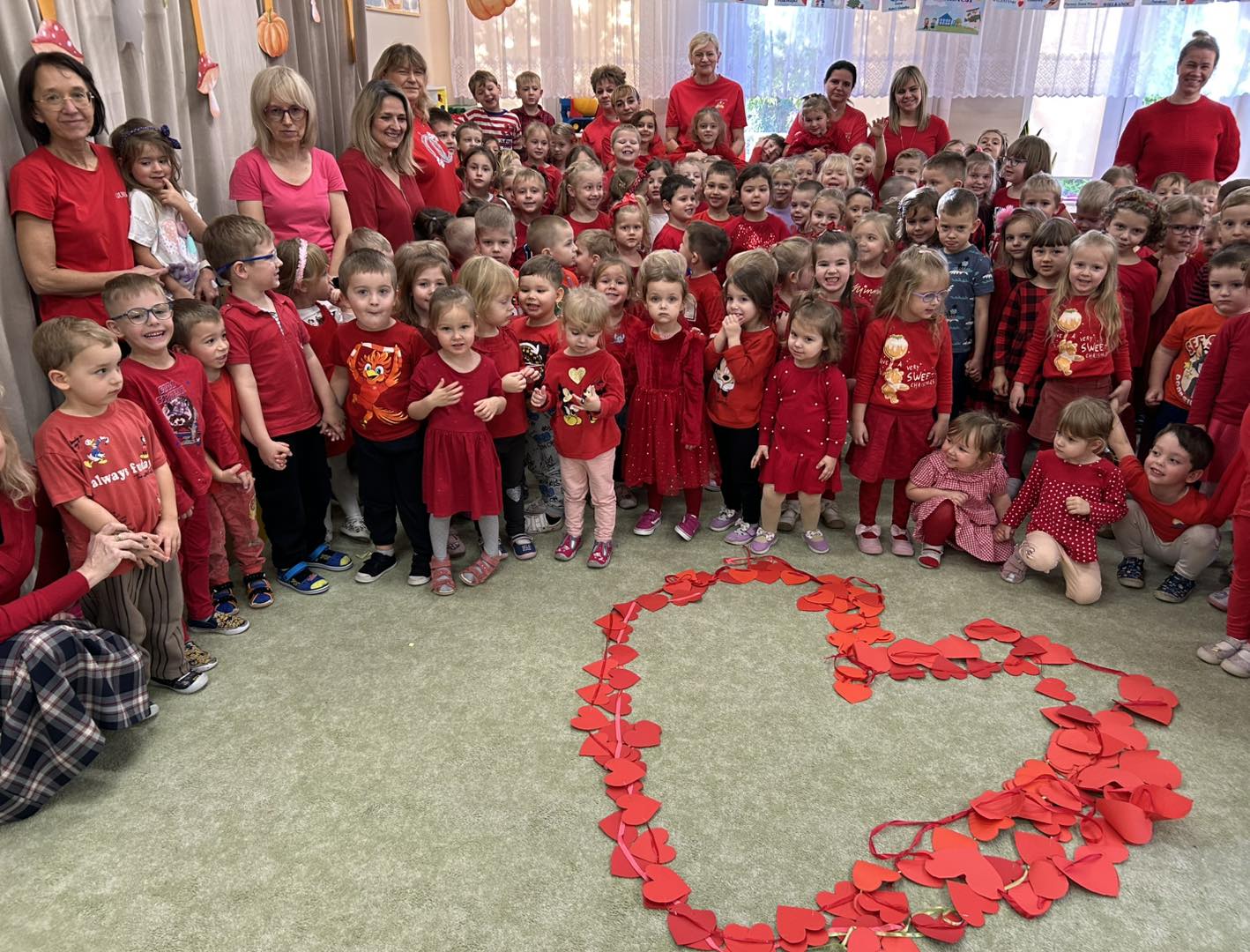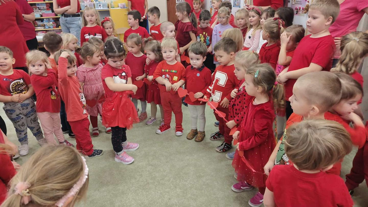 Wspólnie przeżyliśmy piękny moment — każde dziecko przygotowało czerwone serduszko, a następnie połączyliśmy je wszystkie w jeden wielki łańcuch, symbol naszej jedności i wzajemnego wsparcia.
