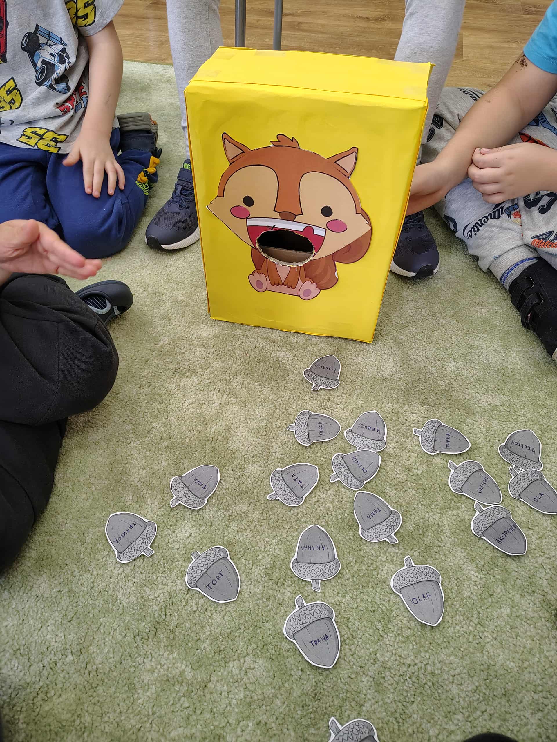 Na zakończenie dzieci wzięły udział w zabawie ruchowo-językowej "Nakarm wiewiórkę" – zadaniem było "nakarmić" naszą wiewiórkę tylko tymi przedmiotami, których nazwy rozpoczynają się na literki O, A lub T.