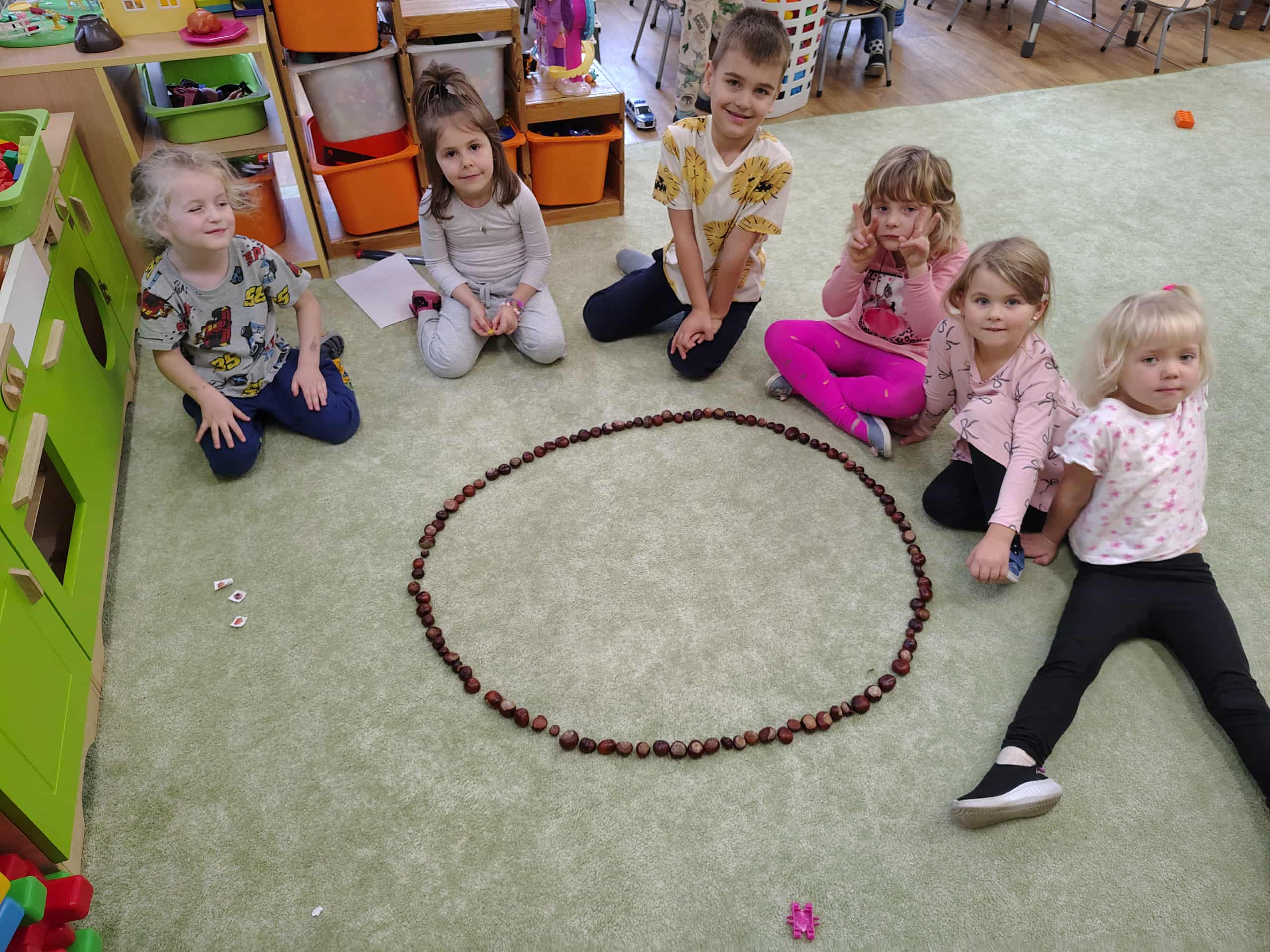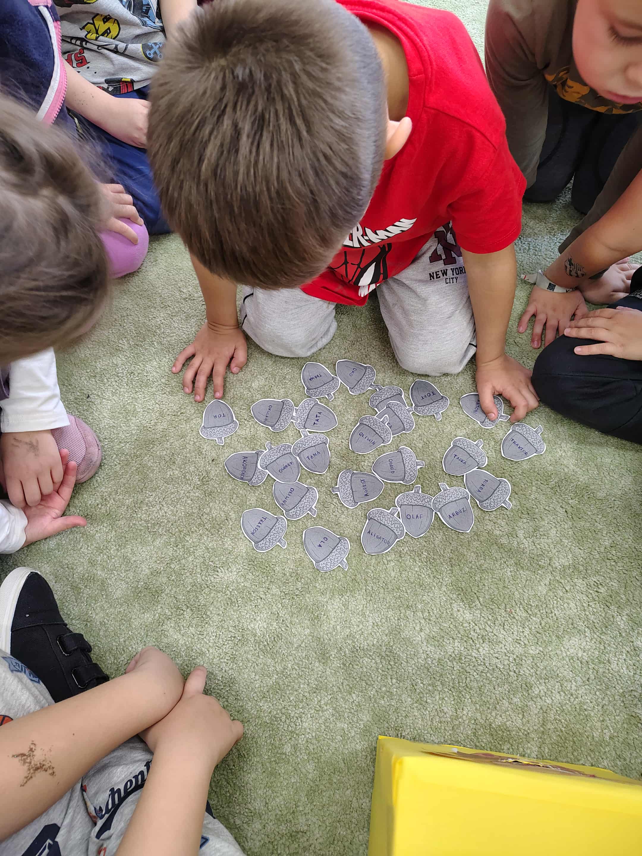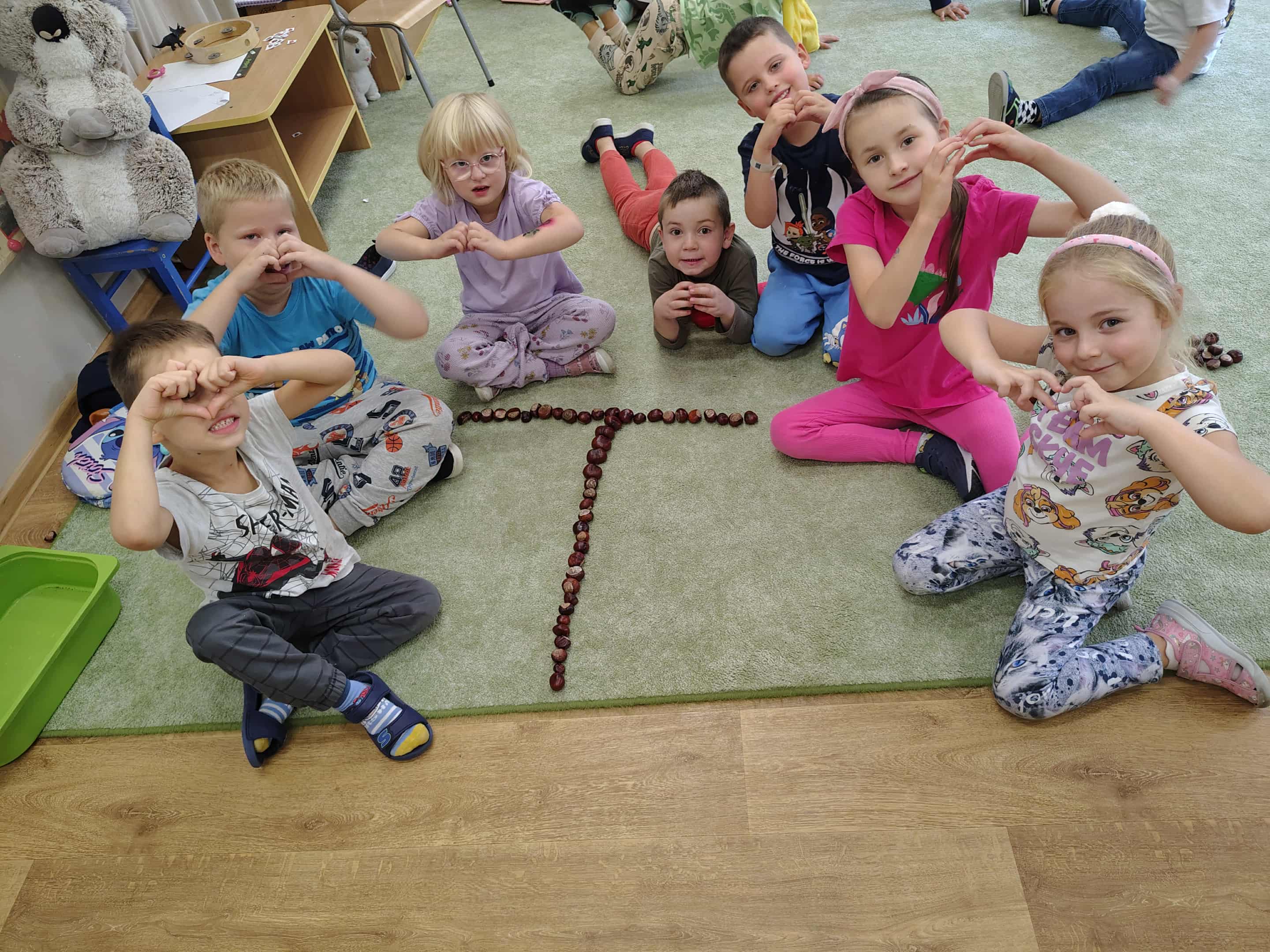 Dzieci rozpoznawały litery w wyrazach, próbowały je układać z kasztanów oraz porównywały ich kształty.