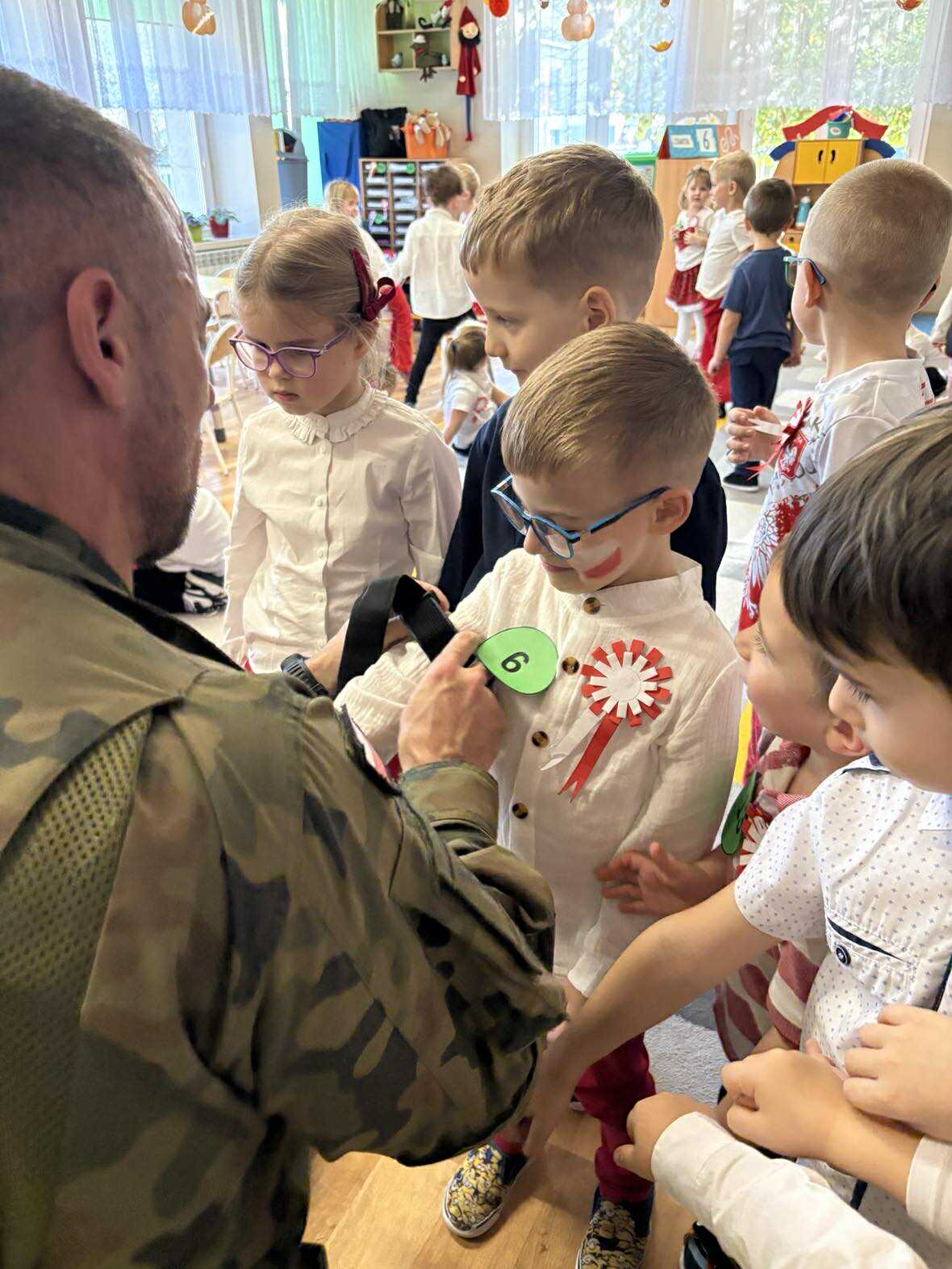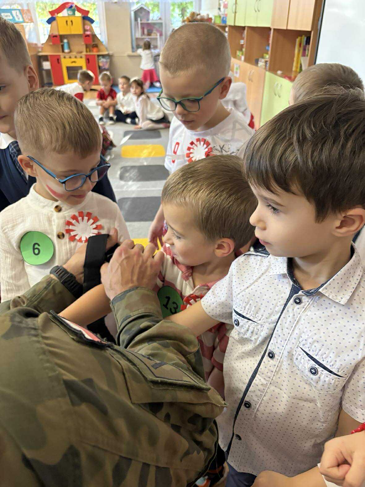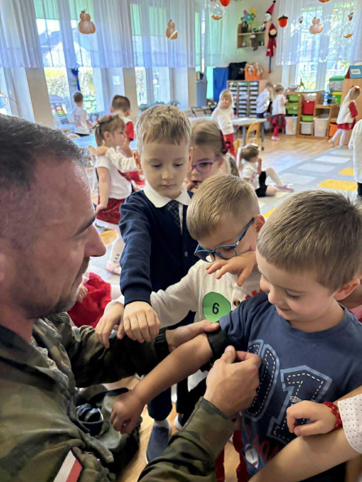 Po pysznym obiedzie było bardzo ciekawe spotkanie z żołnierzem, który opowiedział wiele ciekawych informacji i pokazał nam swoje wojskowe akcesoria.