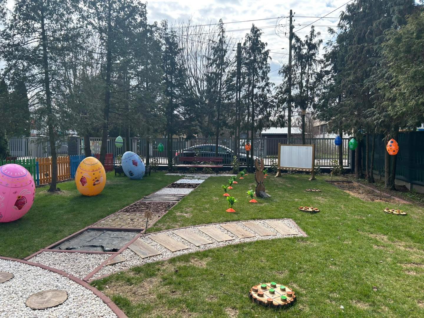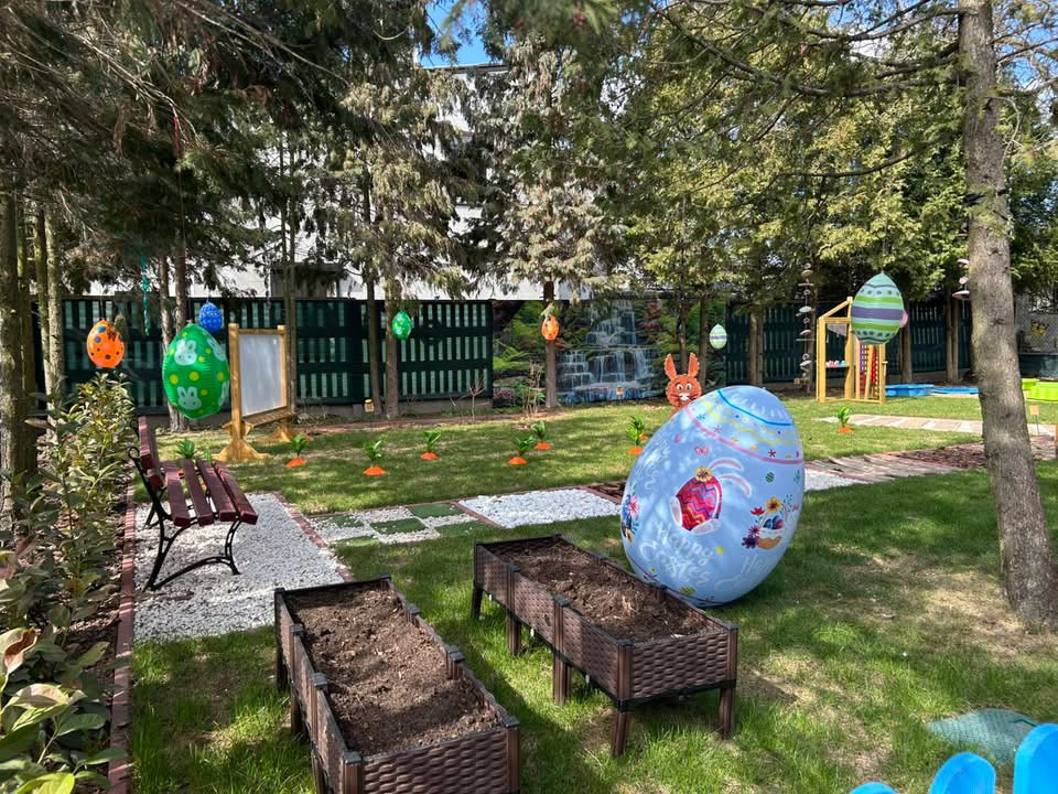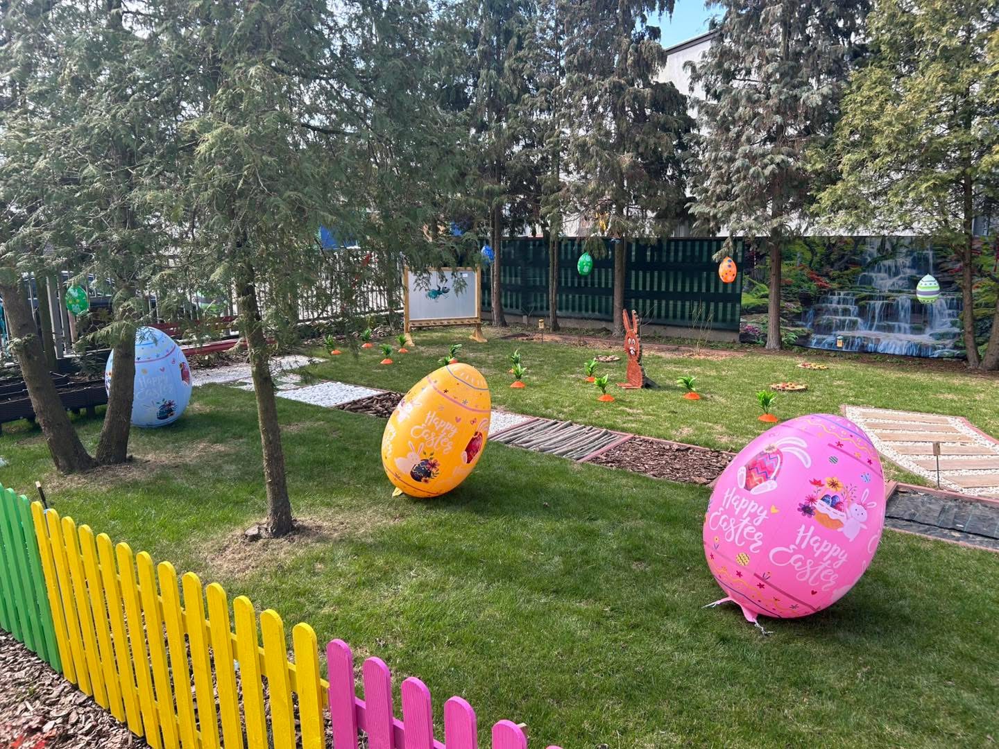 Pojawiły się w nim olbrzymie, kolorowe jajka, być może pozostawione przez wielkanocnego króliczka, które przyciągają wzrok i budzą dziecięcą ciekawość. Z ziemi wyłaniają się natomiast pomarańczowe marchewki, dodające przestrzeni jeszcze więcej wiosennego charakteru.