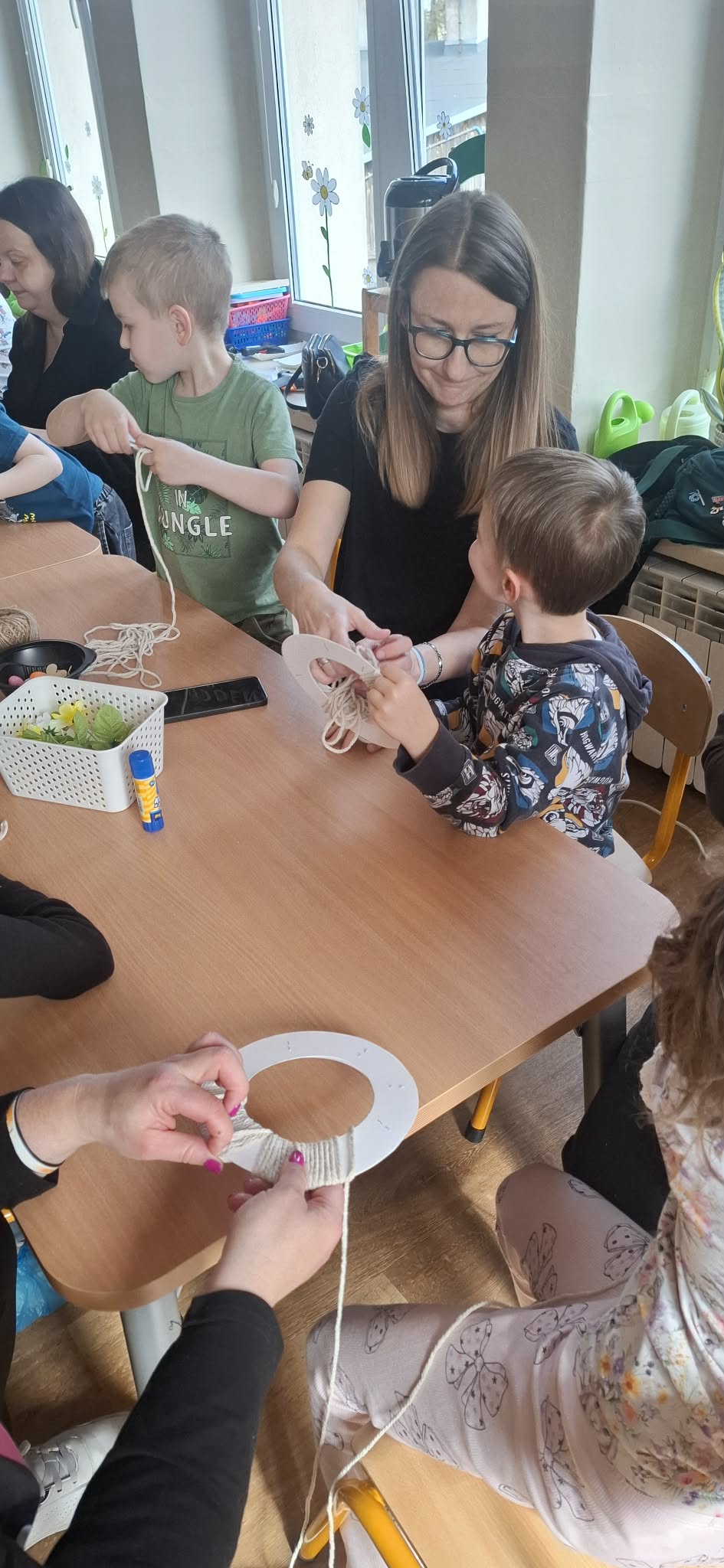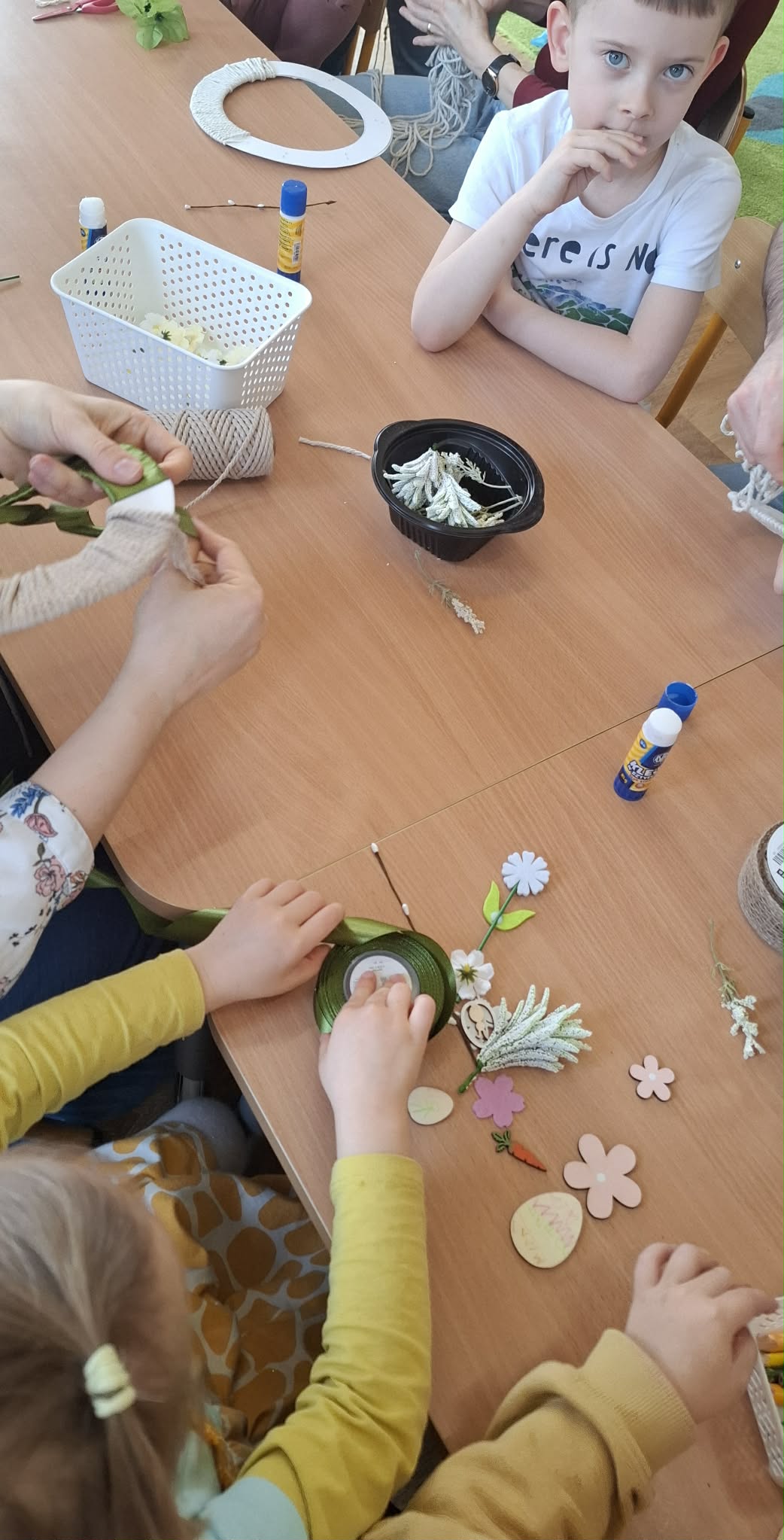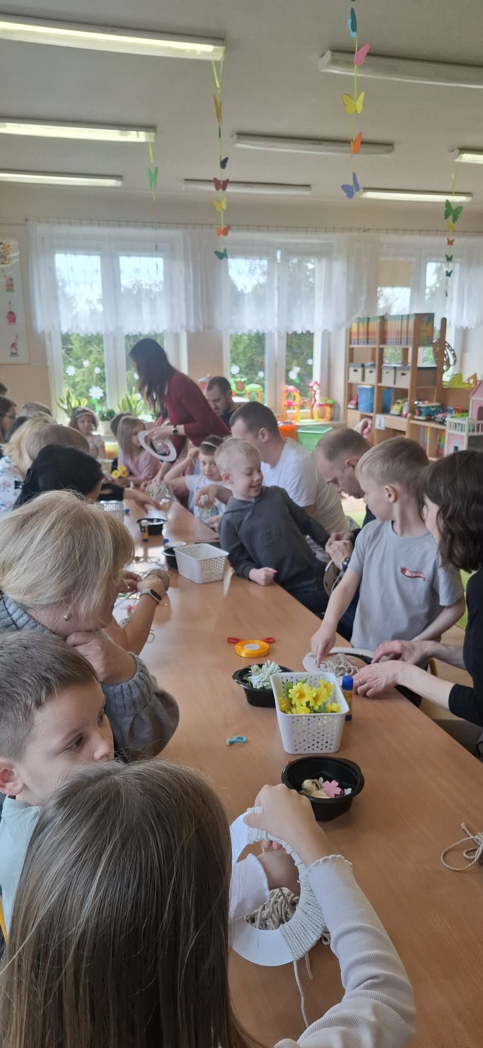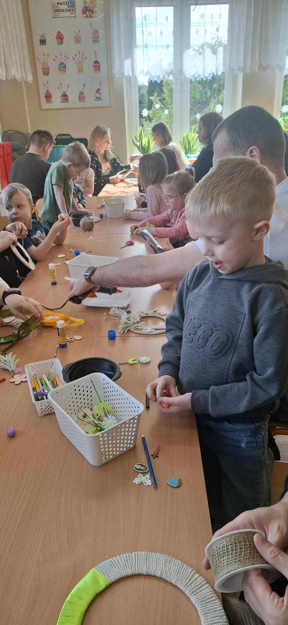 Dzieci wraz z rodzicami z zaangażowaniem tworzyły piękne wianki wielkanocne, wykorzystując różnorodne materiały i ozdoby.