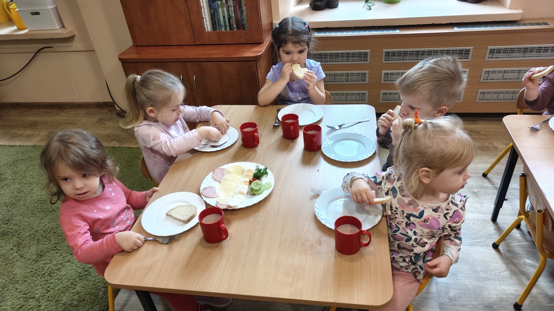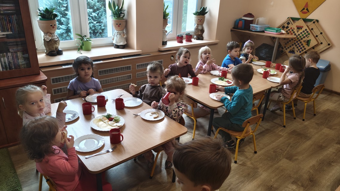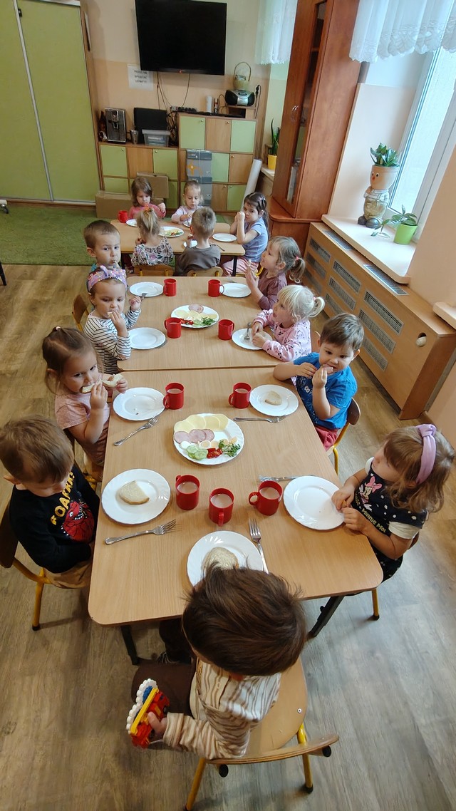 W najmłodszej grupie stawiamy na rozwijanie samodzielności już od pierwszych przedszkolnych dni. Dzieci próbują swoich sił w przygotowywaniu własnych kanapek. Podczas śniadania samodzielnie wybierają z talerzy to, na co mają ochotę, decydując o swoich ulubionych dodatkach. To nie tylko świetna zabawa, ale również ważna lekcja podejmowania decyzji, ćwiczenie sprawności rąk oraz nauka odpowiedzialności za własne wybory.