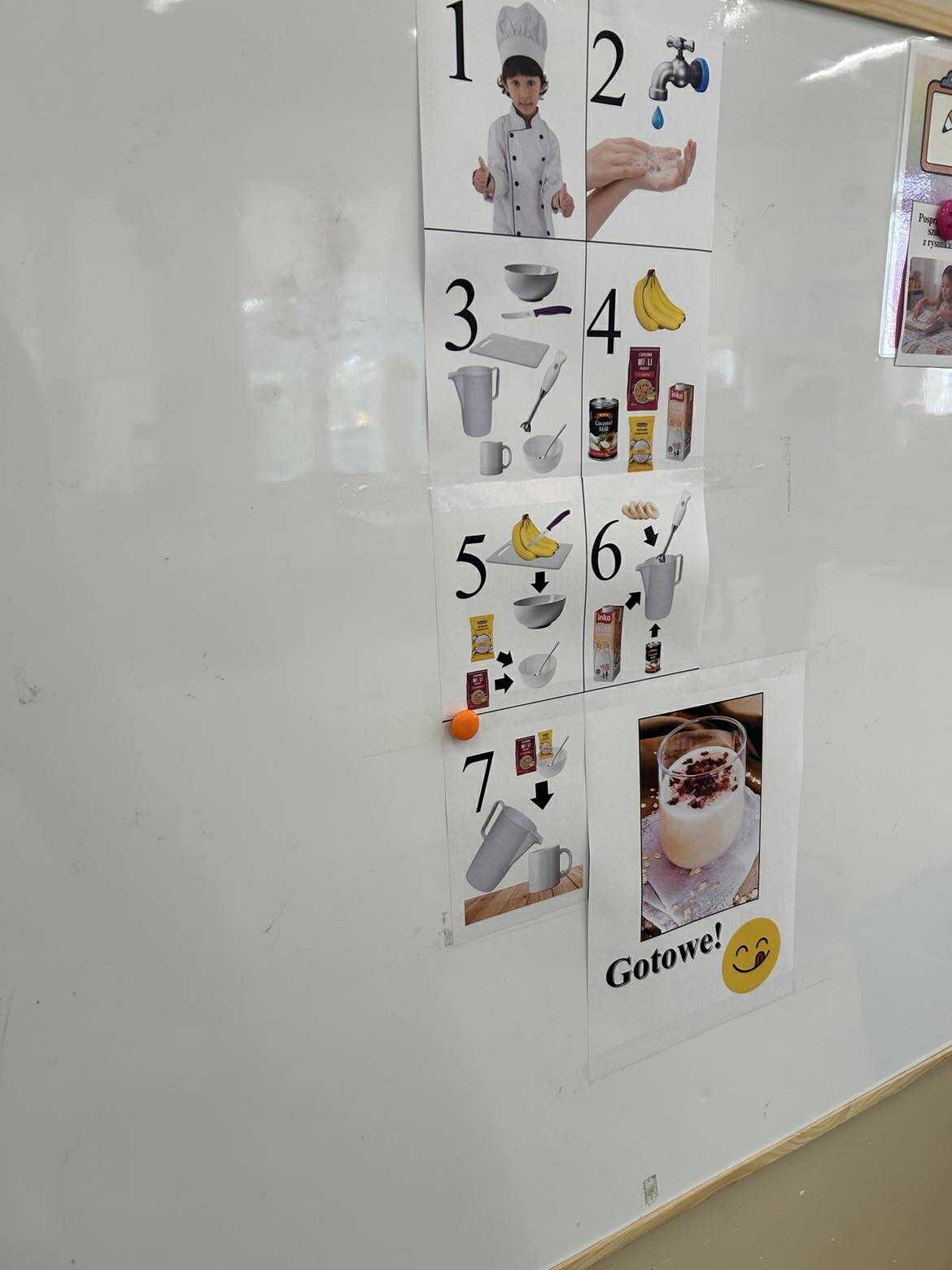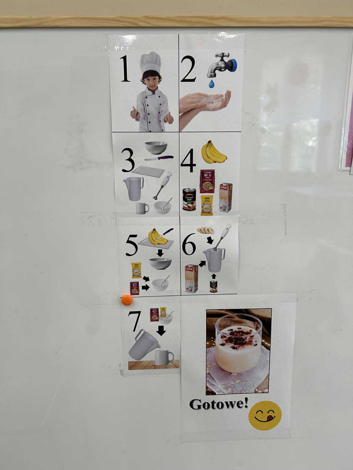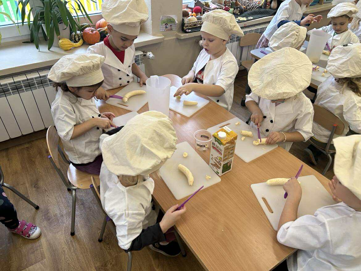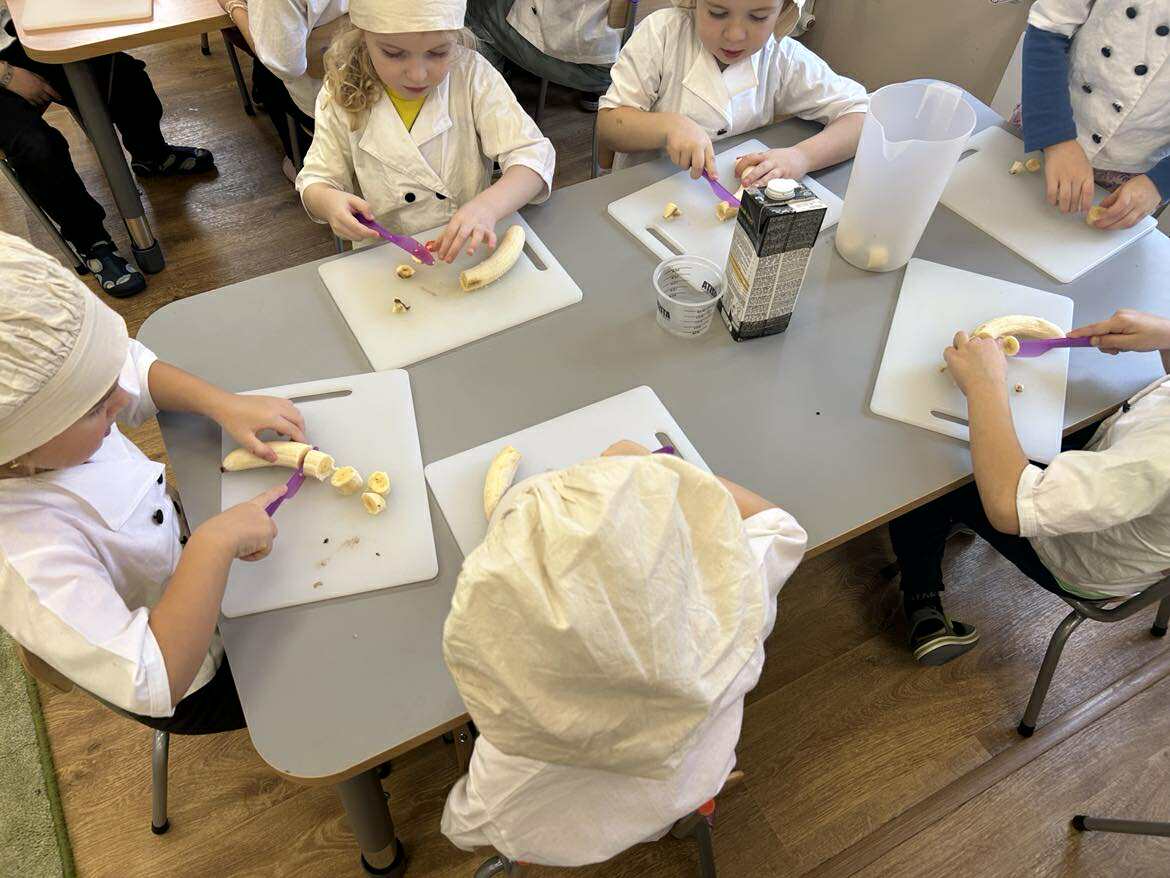 Dzieci samodzielnie obierały i kroiły banany, dokładnie realizując kolejne etapy pracy zgodnie z obrazkową instrukcją. Jedynie najtrudniejszy i wymagający szczególnej ostrożności etap – użycie sprzętu elektrycznego, jakim jest blender – został wykonany przez nauczycielkę. Pozostałe czynności dzieci wykonały samodzielnie, z dużym zaangażowaniem i radością.